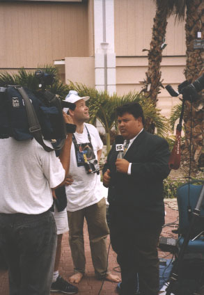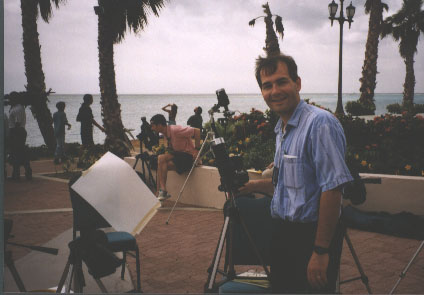 ©1998 Photo by Eric PauerThe local Aruba television station reports on the eclipse from the AL site, interviewing eclipse chaser Olivier Staiger who loaded images of the eclipse onto the Internet in near real-time.