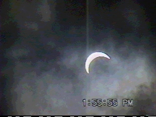 ©1998 Video by Eric PauerOne interesting effect of the clouds during the partial phases was that they sometimes caused an interesting filtering effect on the partially eclipsed sun. This is an image captured by my Sony 8 mm camcorder without a solar filter. Remember you must NOT view the partial phases directly with your eyes without proper filtering!