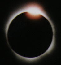At that point, the edge of a small thin passing cloud filtered the corona for about a dozen seconds or so. Then, I heard a jet engine. Surely, a plane would not be landing during totality. However, I looked up and that is exactly what I saw, prompting me to yell look at that "G- D- plane landing." Sure enough, the jet liner with its lights flashing was on its final approach to Aruba's Queen Beatrix airport just to our south--in the middle of totality! This distraction was actually a blessing in disguise, as the jet called my attention to observe the southwest horizon which was a light yellow. I think that the numerous clouds in the area prevented the expected pink sunset color from appearing. I clearly remember saying to myself, you are now in the shadow of the moon, and feeling the power of the event. The horizon all around was this yellowish color, but it was a bit brighter to the southwest. Surely, the eclipse was not ending? Then someone yelled "twenty seconds," indicating that third contact and the end of totality was imminent. I ran back to my camera to capture the second diamond ring at the end of totality. I realigned my camcorder and got my SLR camera ready just in the nick of time. As I snapped photos, the red chromosphere then the first bit of photosphere appeared at the bottom right edge of the moon, forming a brilliant diamond ring. Totality ended at 2:12:54 pm, exactly as predicted by Fred Espenak, known as the "Michael Jordan of eclipse experts" by at least one of his colleagues. The landscape around quickly brightened as if someone was turning up a dimmer switch on the sun.